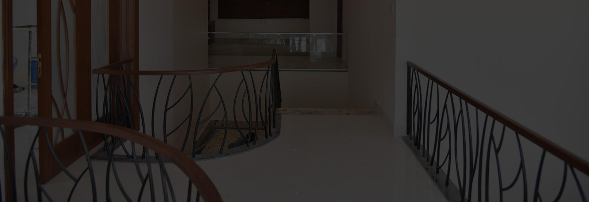 An ultra-chic staircase design, favoring the black-to-brown railing, wood & glass door & a window wall